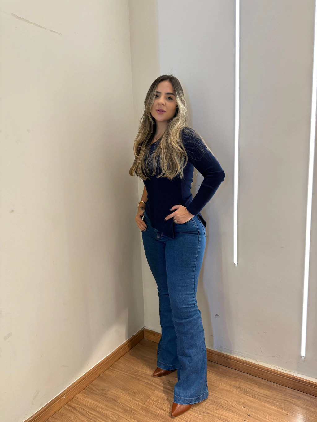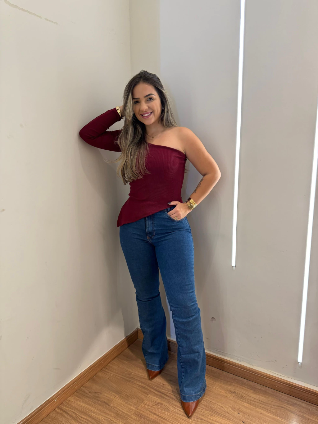 Ela é tamanho único, mas o tecido se adapta muito bem a diferentes tipos de corpo, valorizando a silhueta com elegância e conforto.