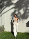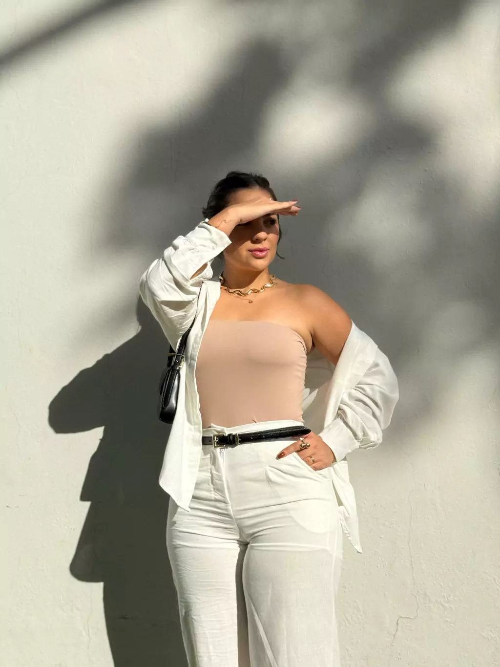 Conjunto confeccionado em tecido misto de algodão, viscose, linho e poliéster. Combinação que garante conforto, leveza e excelente estrutura. A camisa possui fechamento por botões frontais, gola tradicional e punhos ajustáveis, com caimento soltinho e elegante. A calça modelo wide leg conta com elástico na parte posterior do cós, oferecendo melhor ajuste ao corpo sem comprometer o conforto. A modelagem ampla da calça proporciona movimento e sofisticação, ideal para composições modernas e atemporais.