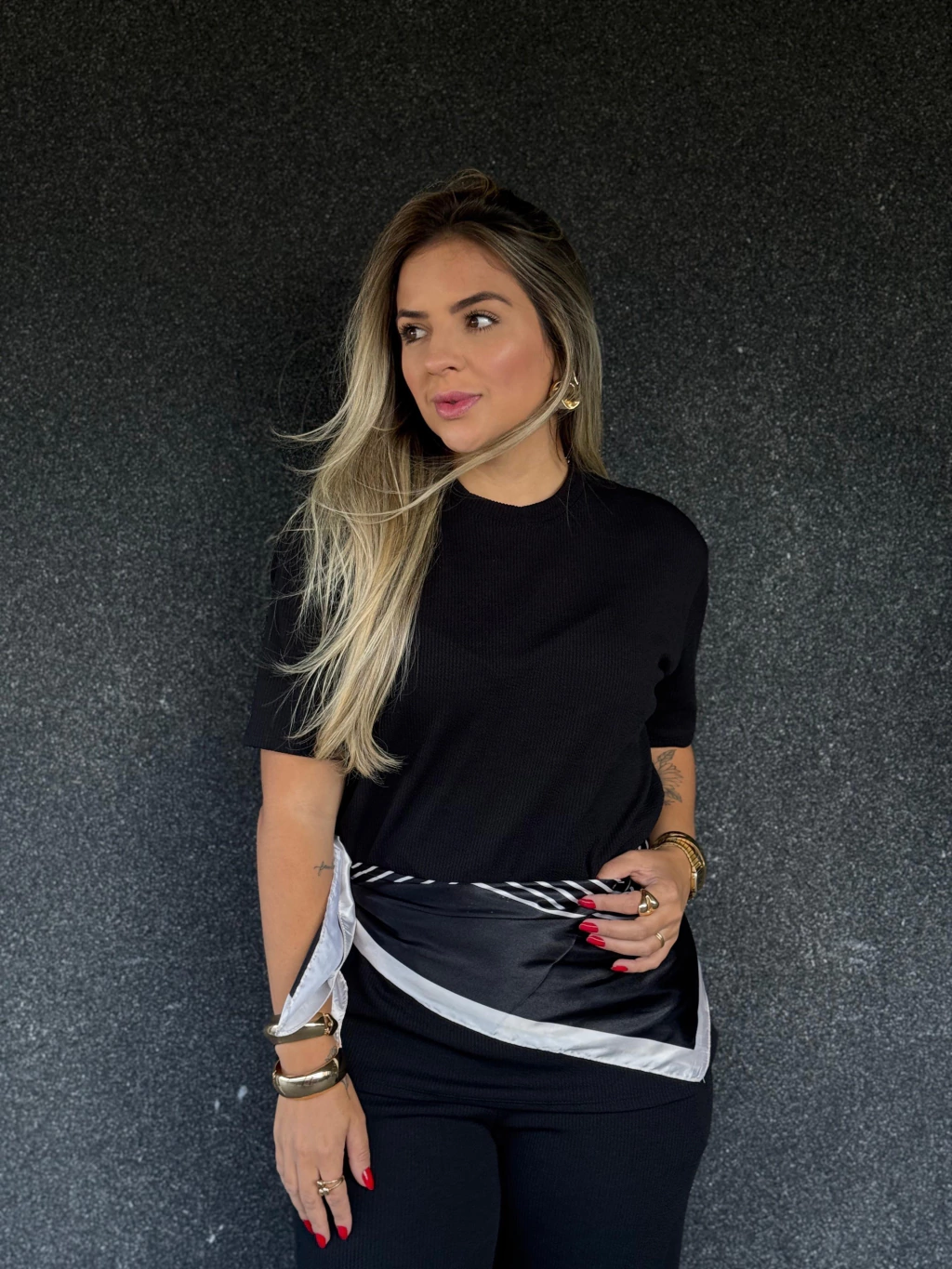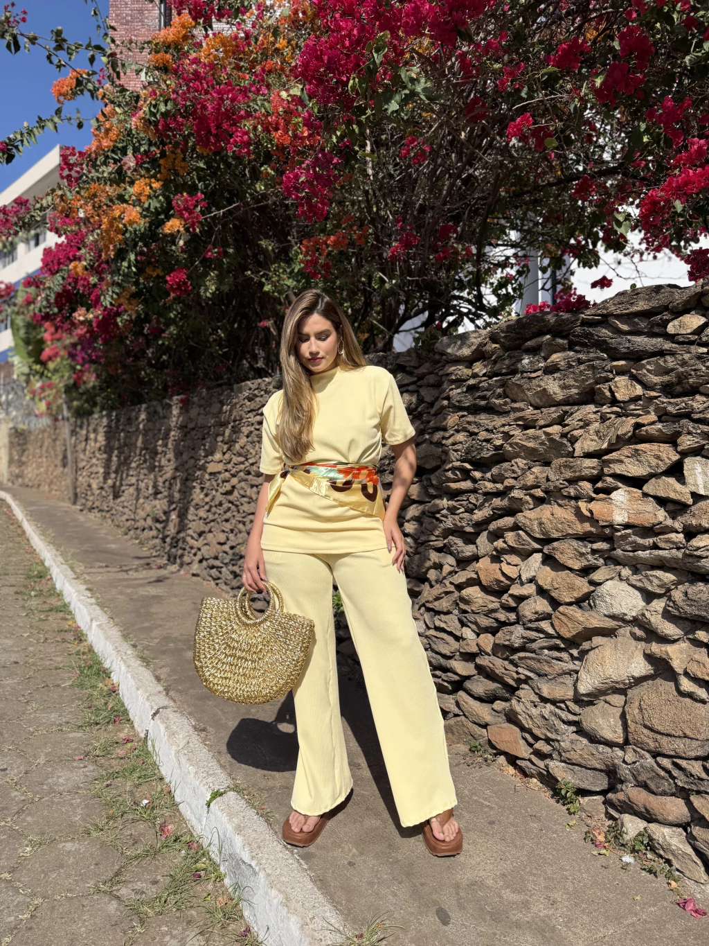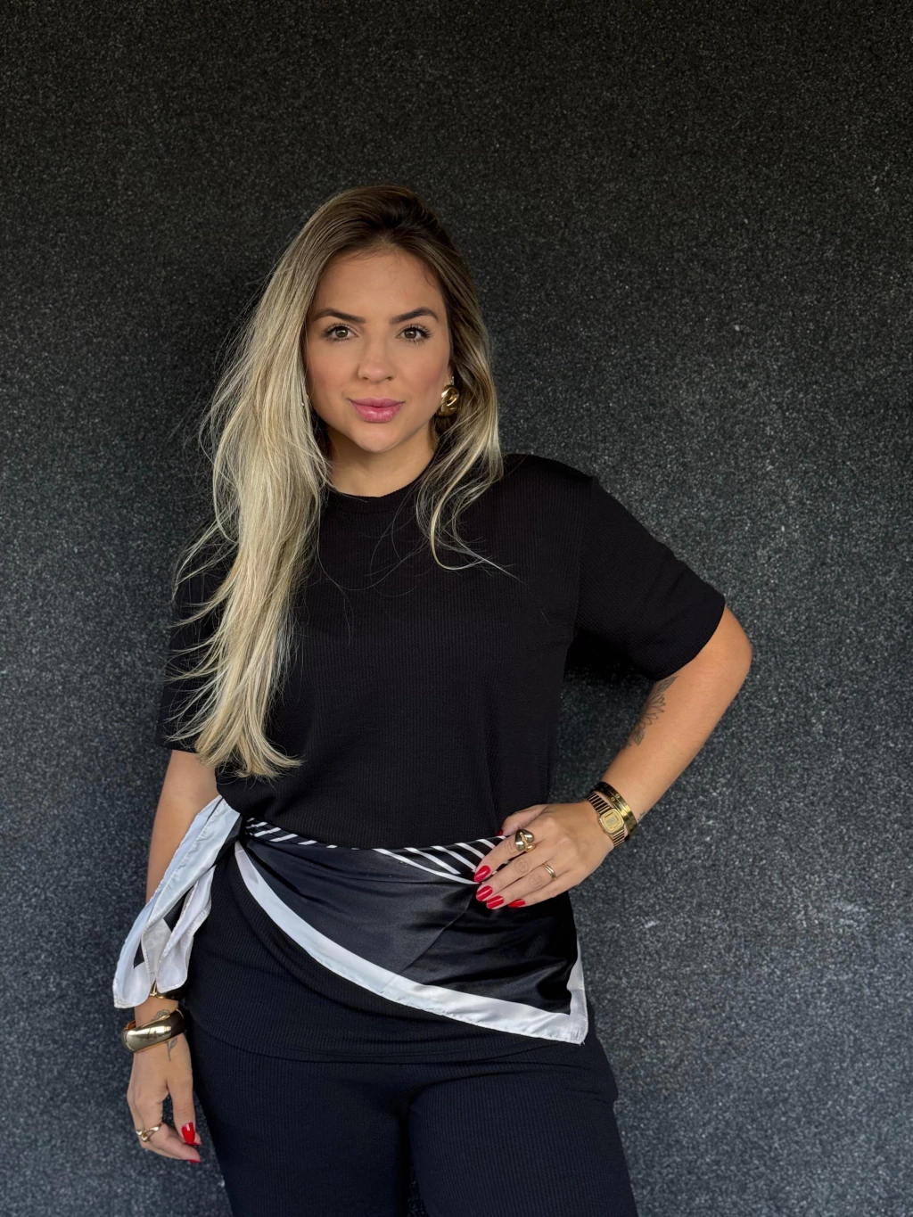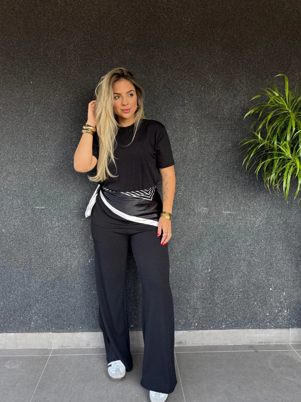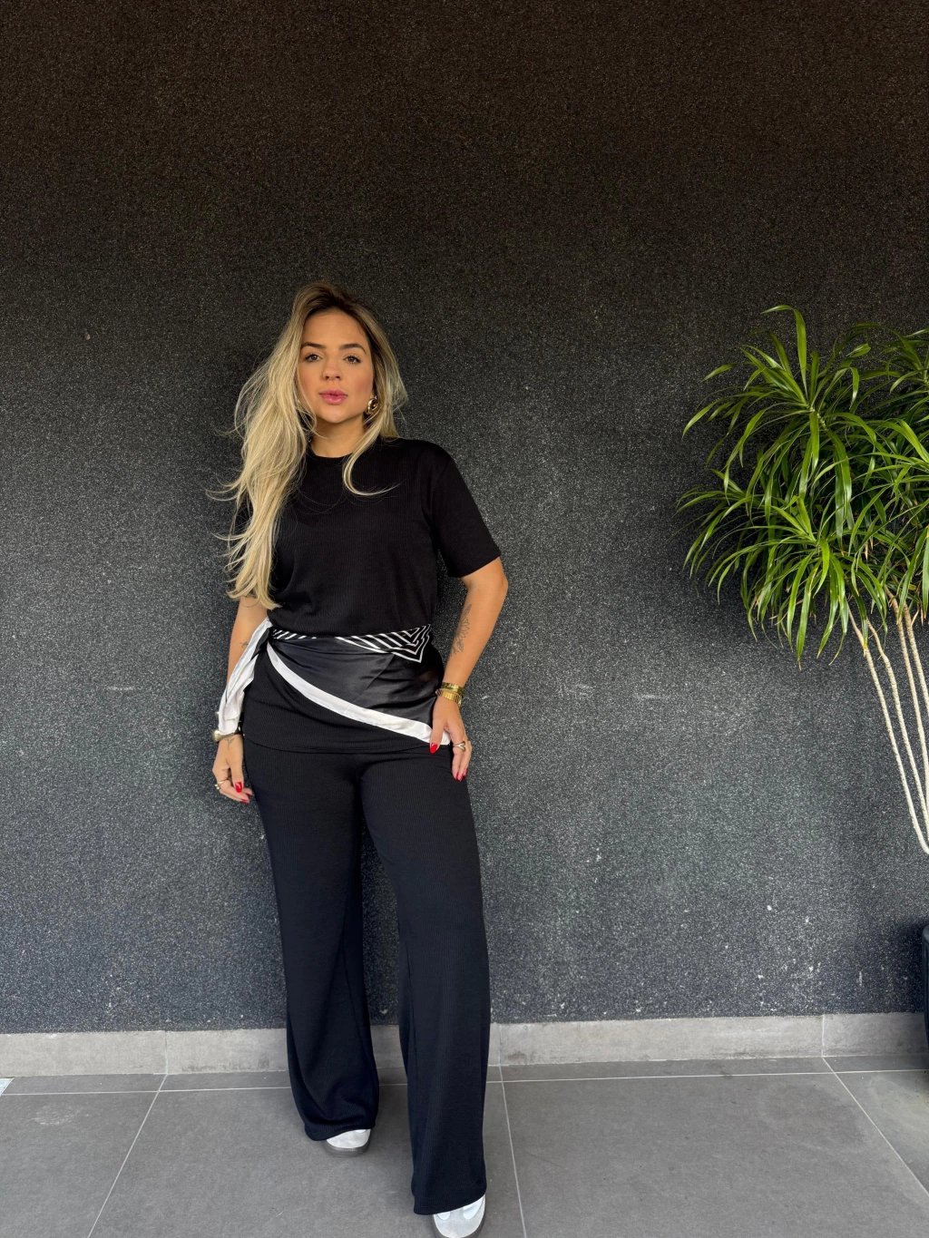 A blusa possui modelagem mais alongada, cobrindo o quadril e trazendo segurança, já que também disfarça o bumbum de forma natural e sofisticada. A calça completa o look com equilíbrio, garantindo mobilidade e leveza no dia a dia.