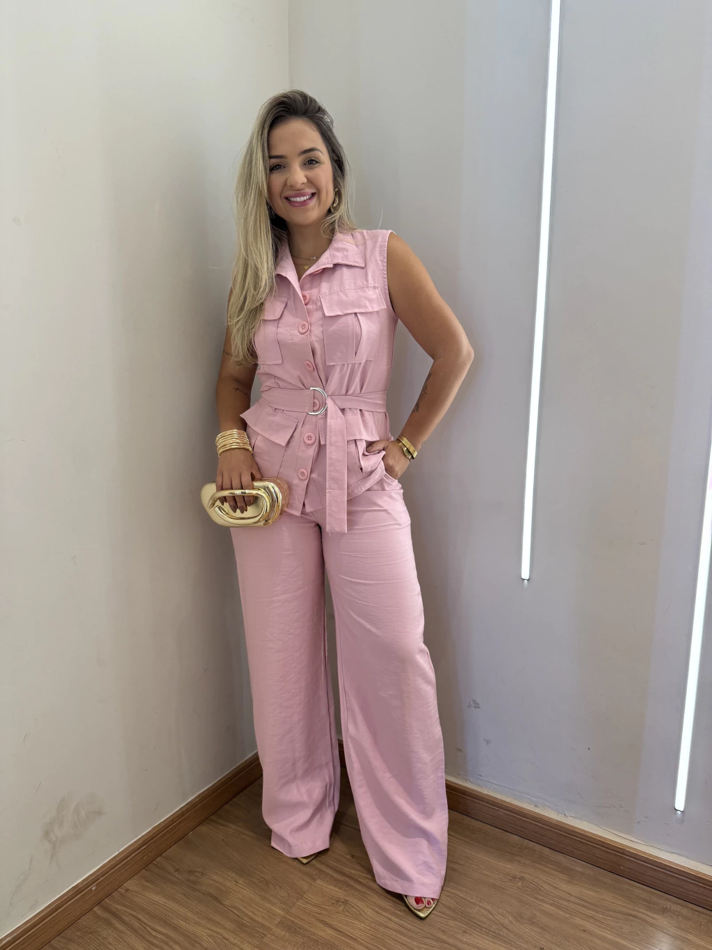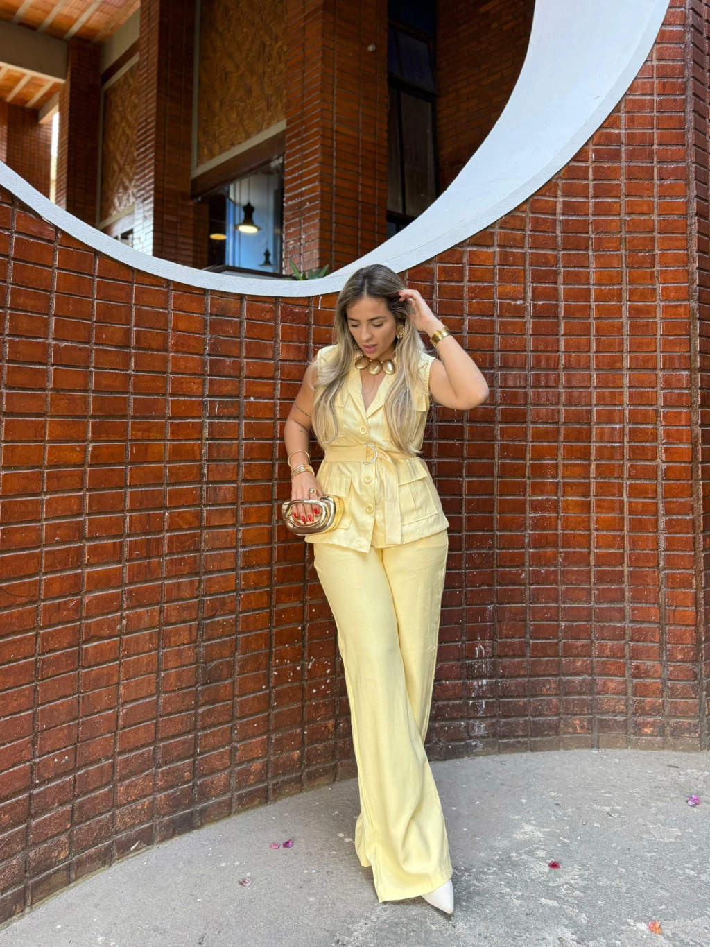 O colete possui fechamento frontal em botões e bolsos aplicados que dão charme extra à peça. O cinto do mesmo tecido acompanha o conjunto, permitindo marcar a cintura e valorizar a silhueta.