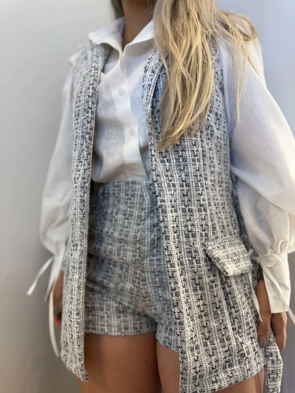 O colete é estruturado, acompanha faixa-cinto do mesmo tecido para marcar a cintura e pode ser usado de diferentes formas: aberto, fechado ou até sobreposto a outras peças. Já o short possui bolsos frontais funcionais, cós delicado e fechamento lateral com zíper invisível, proporcionando acabamento limpo e sofisticado.