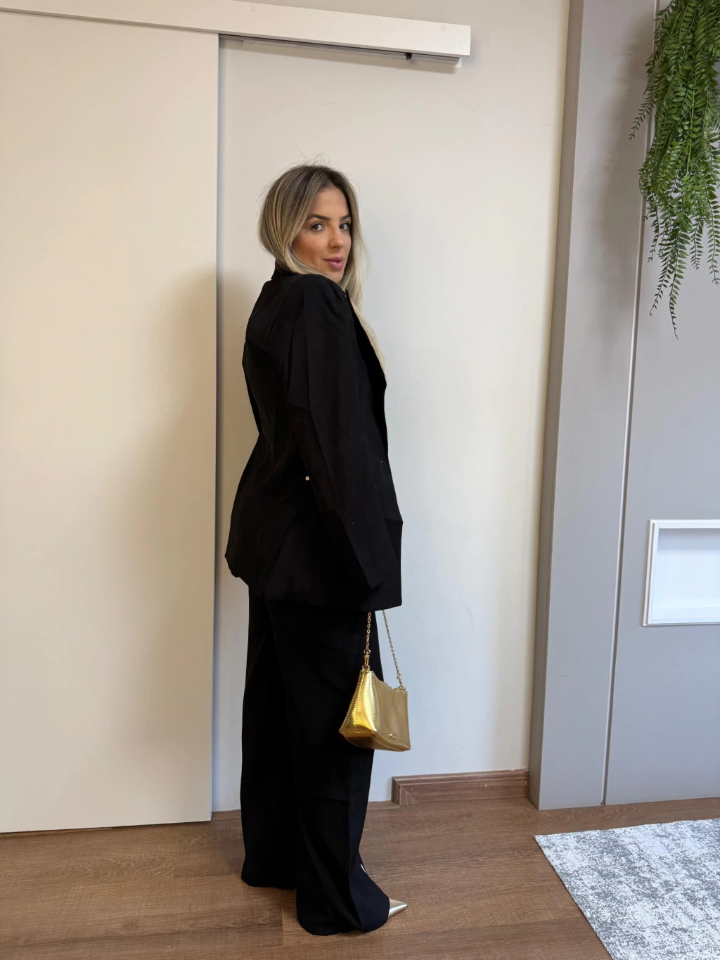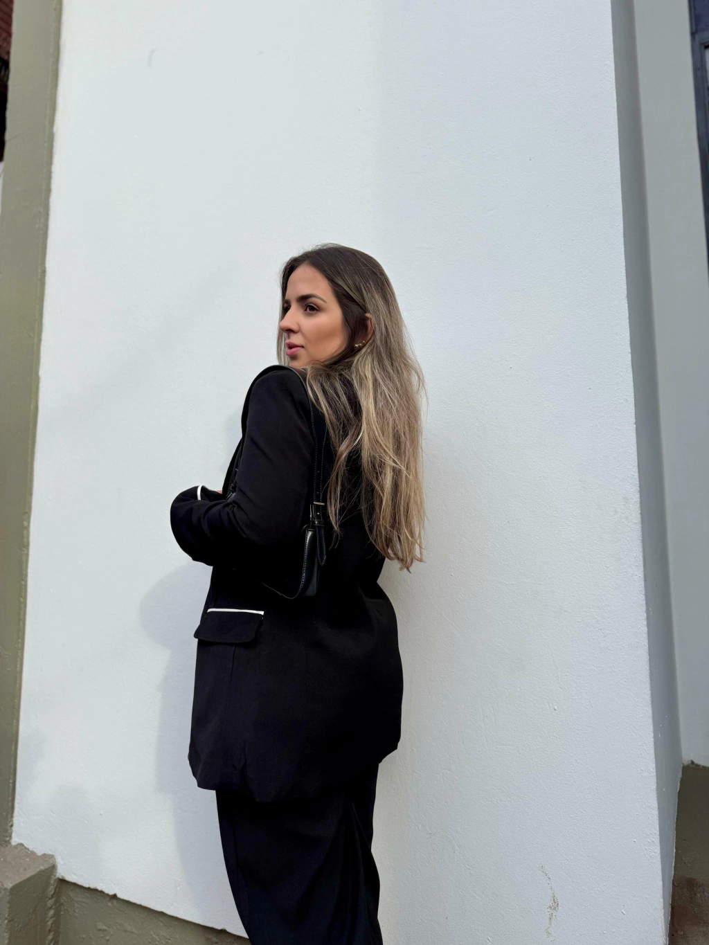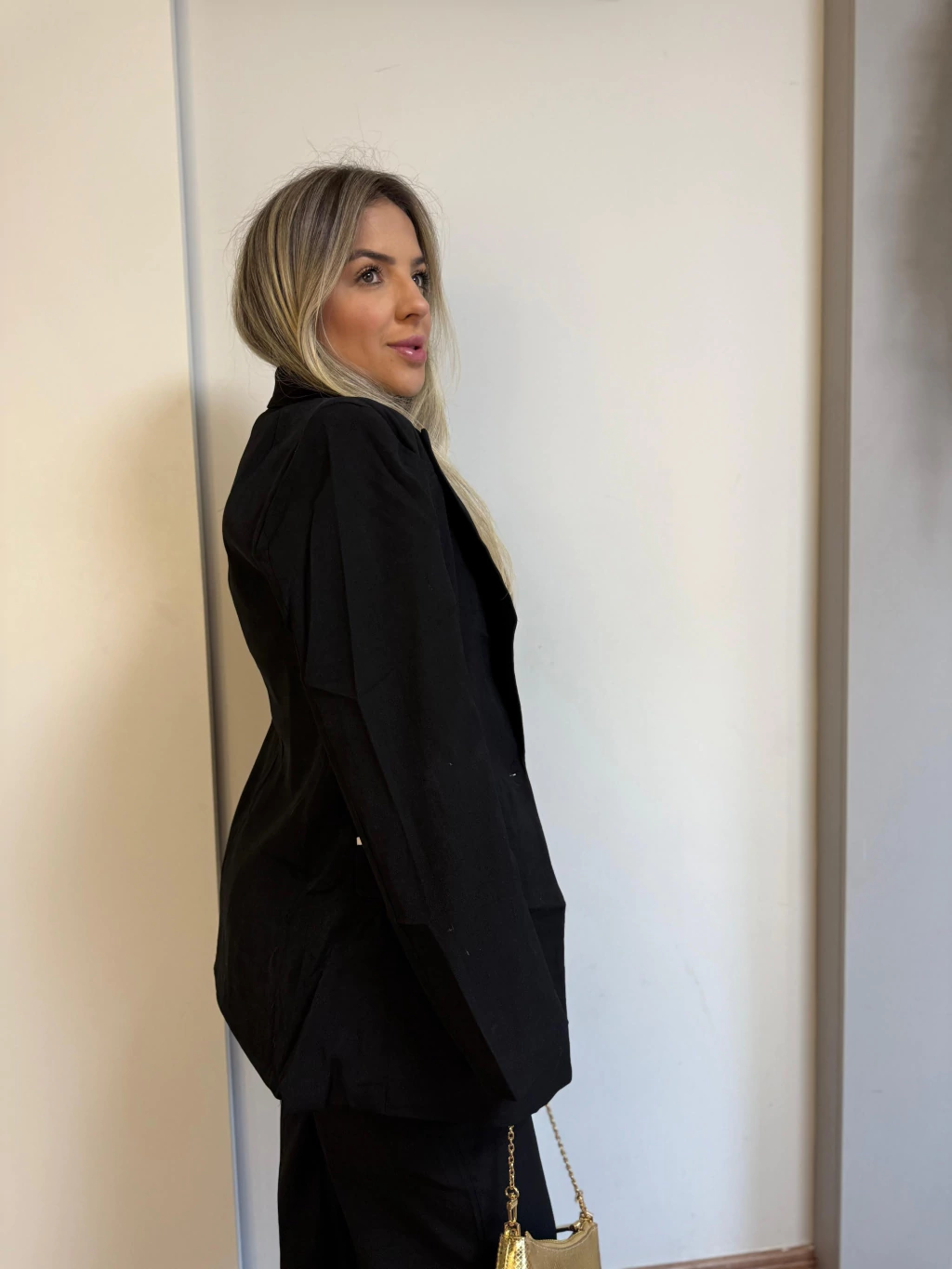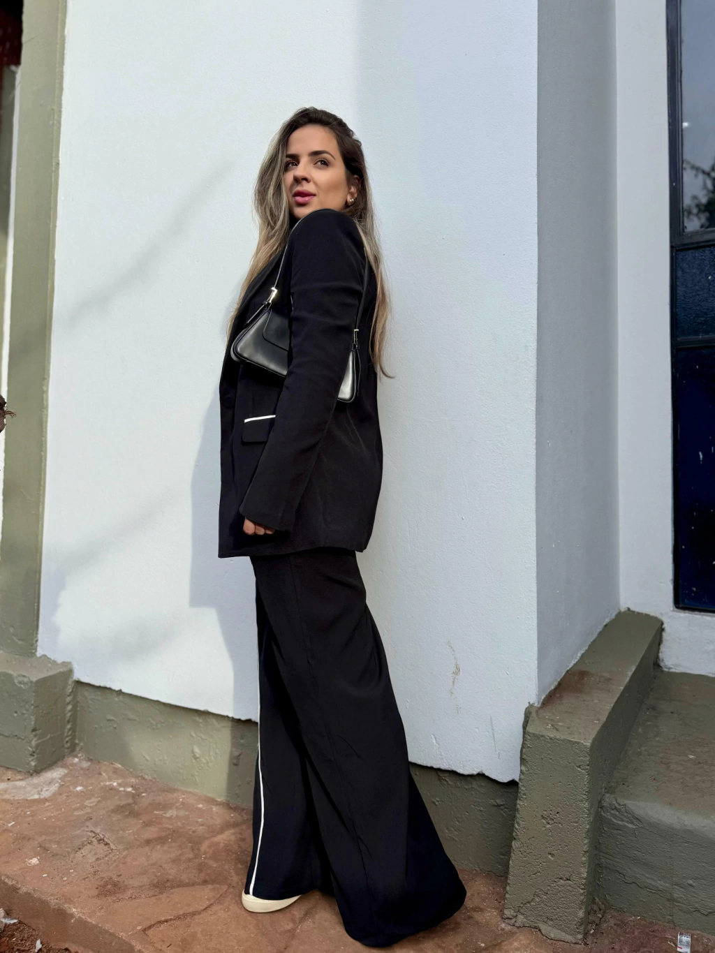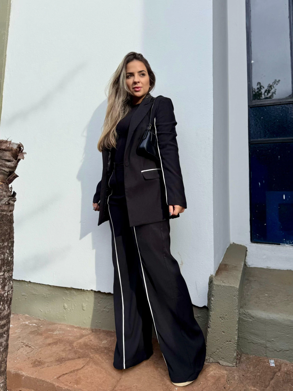 • Listra branca lateral que acompanha o blazer, criando continuidade visual e alongando a perna;
