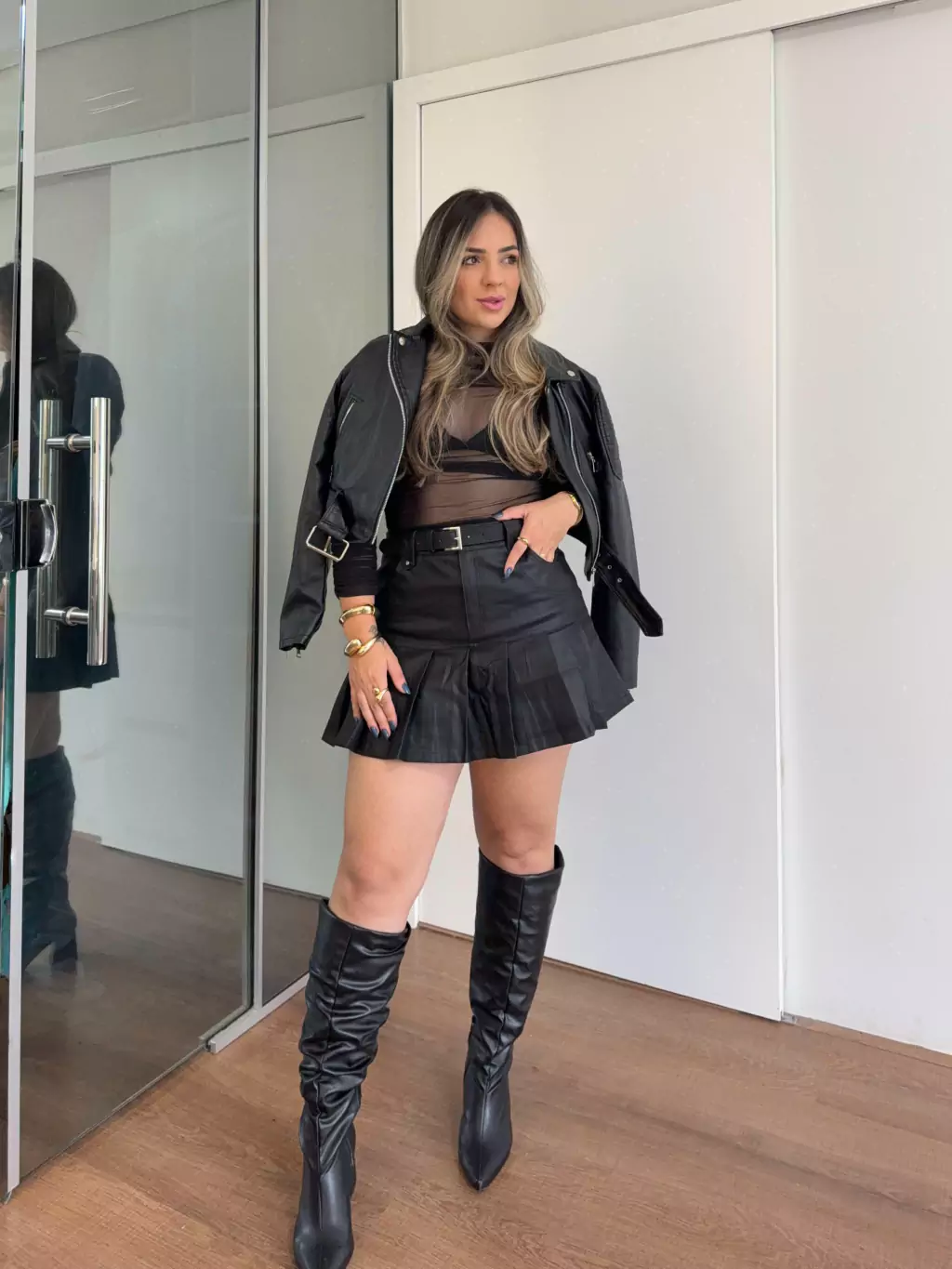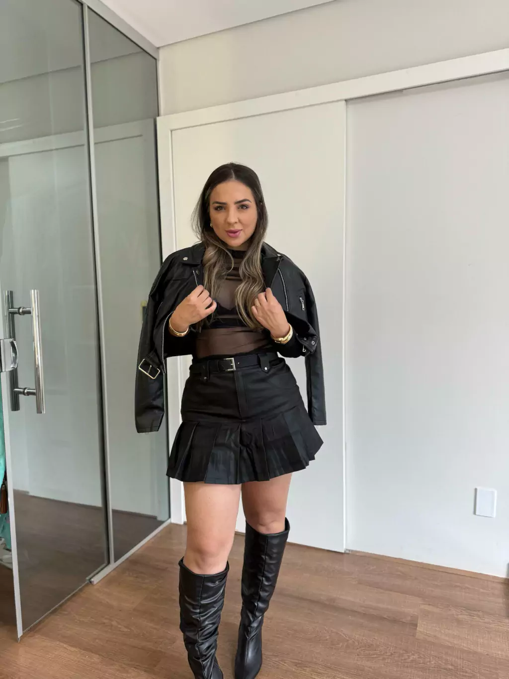 A jaqueta preta em couro sintético é a definição perfeita de estilo atemporal com um toque moderno e marcante. Produzida em material sintético de alta qualidade, com acabamento que imita fielmente o couro natural, ela alia elegância, durabilidade e é uma opção vegana consciente.