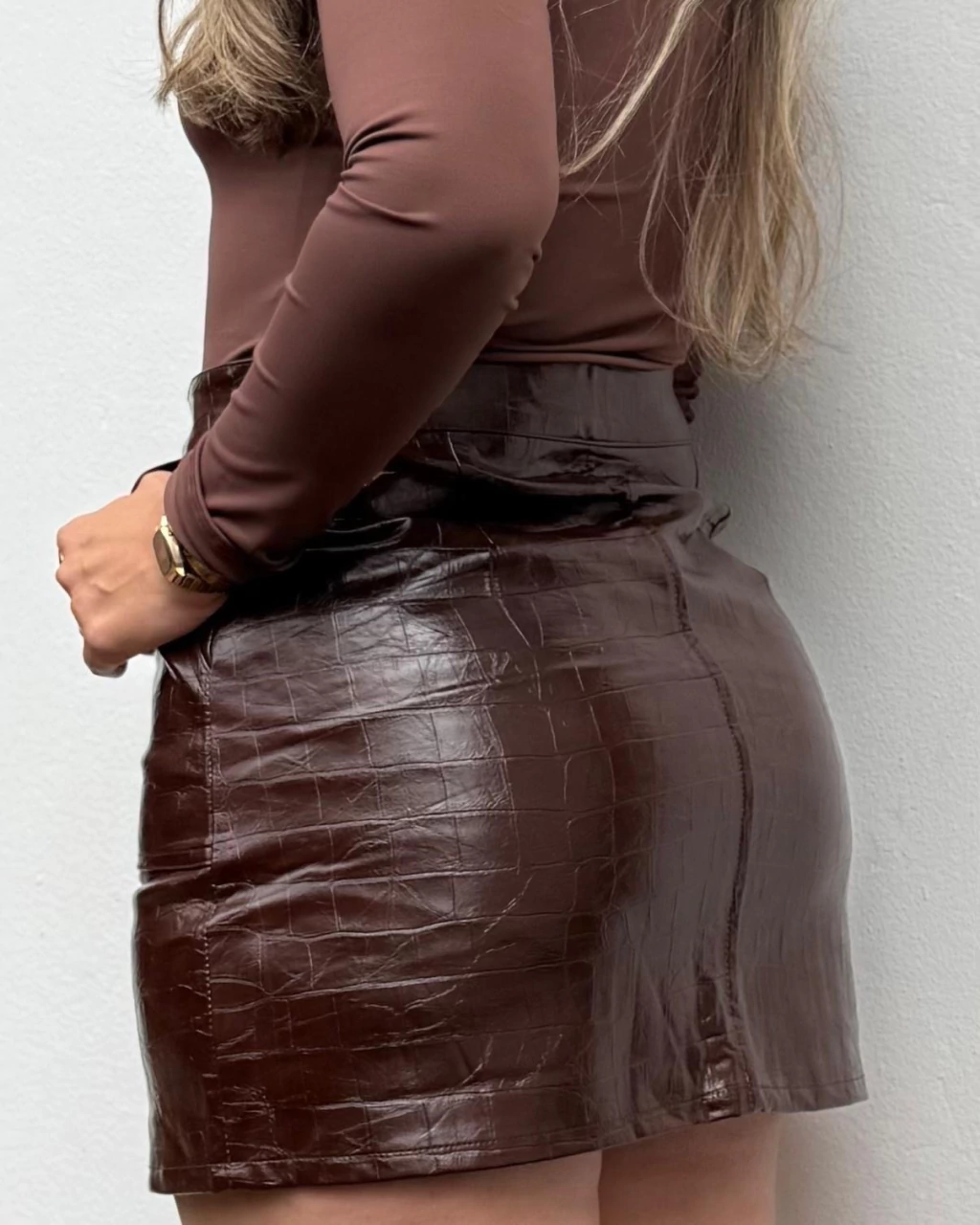 A Saia Brenda é aquela peça-chave que transforma qualquer look com atitude e elegância. Confeccionada em couro PU envernizado, ela tem acabamento brilhoso e textura estilo croco, que traz sofisticação e um toque moderno ao visual.