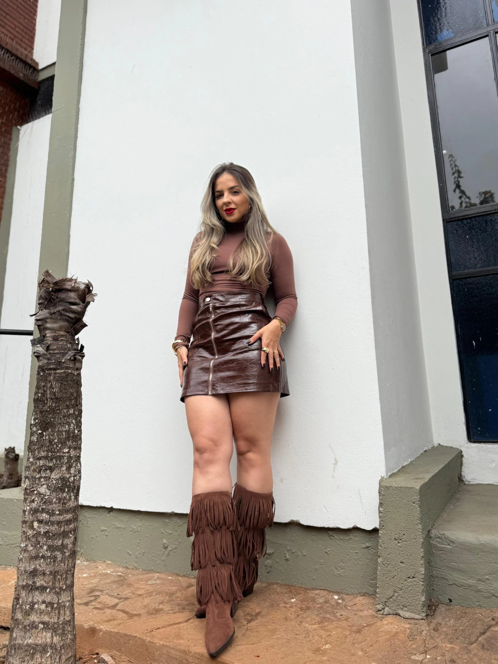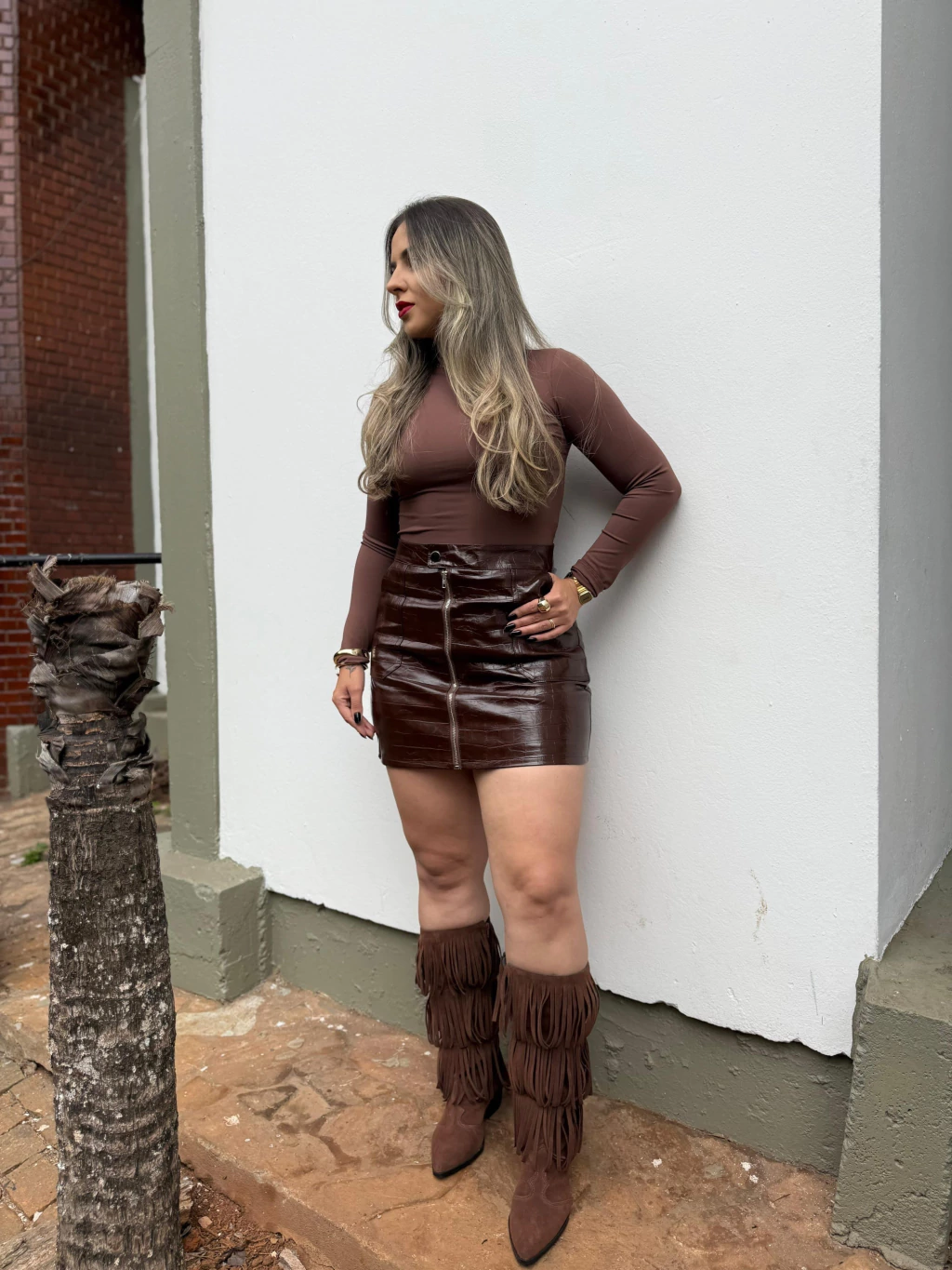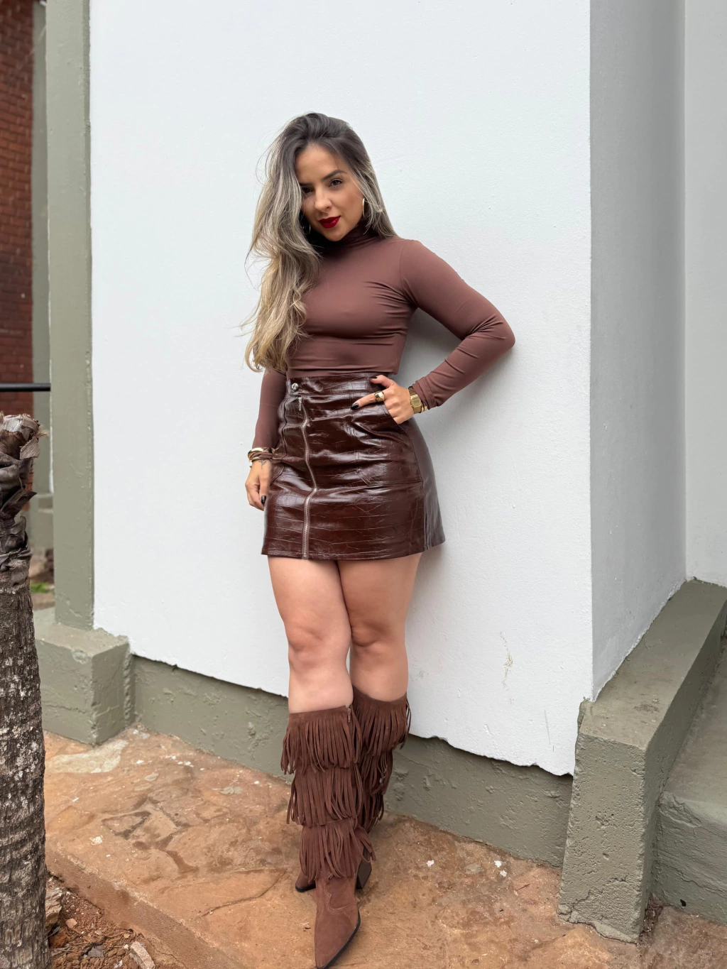 Disponível nos tamanhos P, M e G, a Saia Brenda é versátil para combinar com blusas justas, camisas ou até uma jaqueta oversized.
