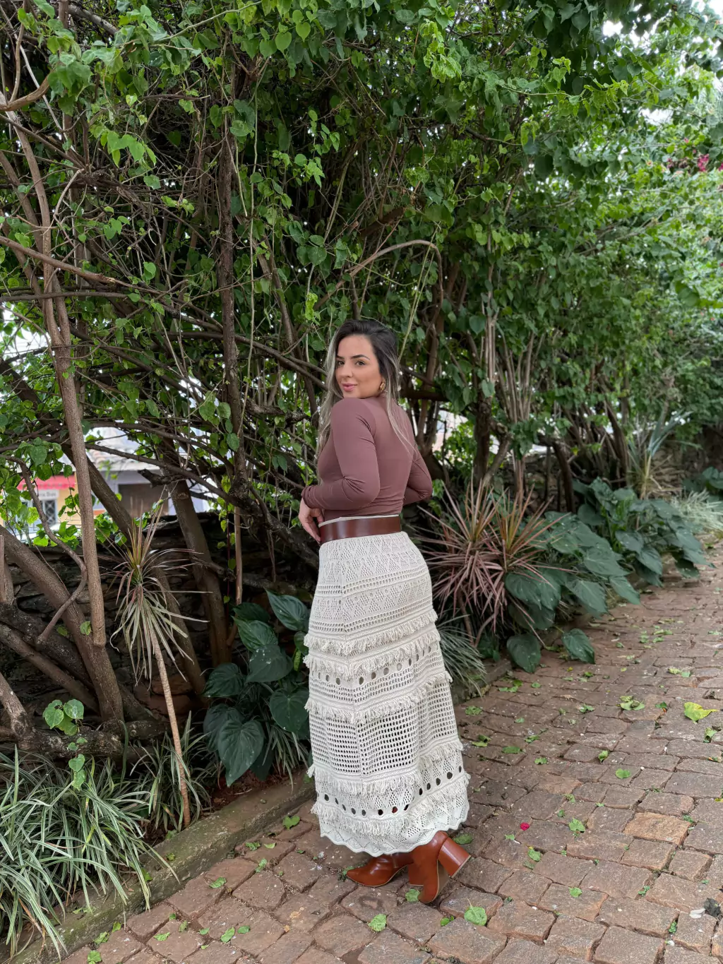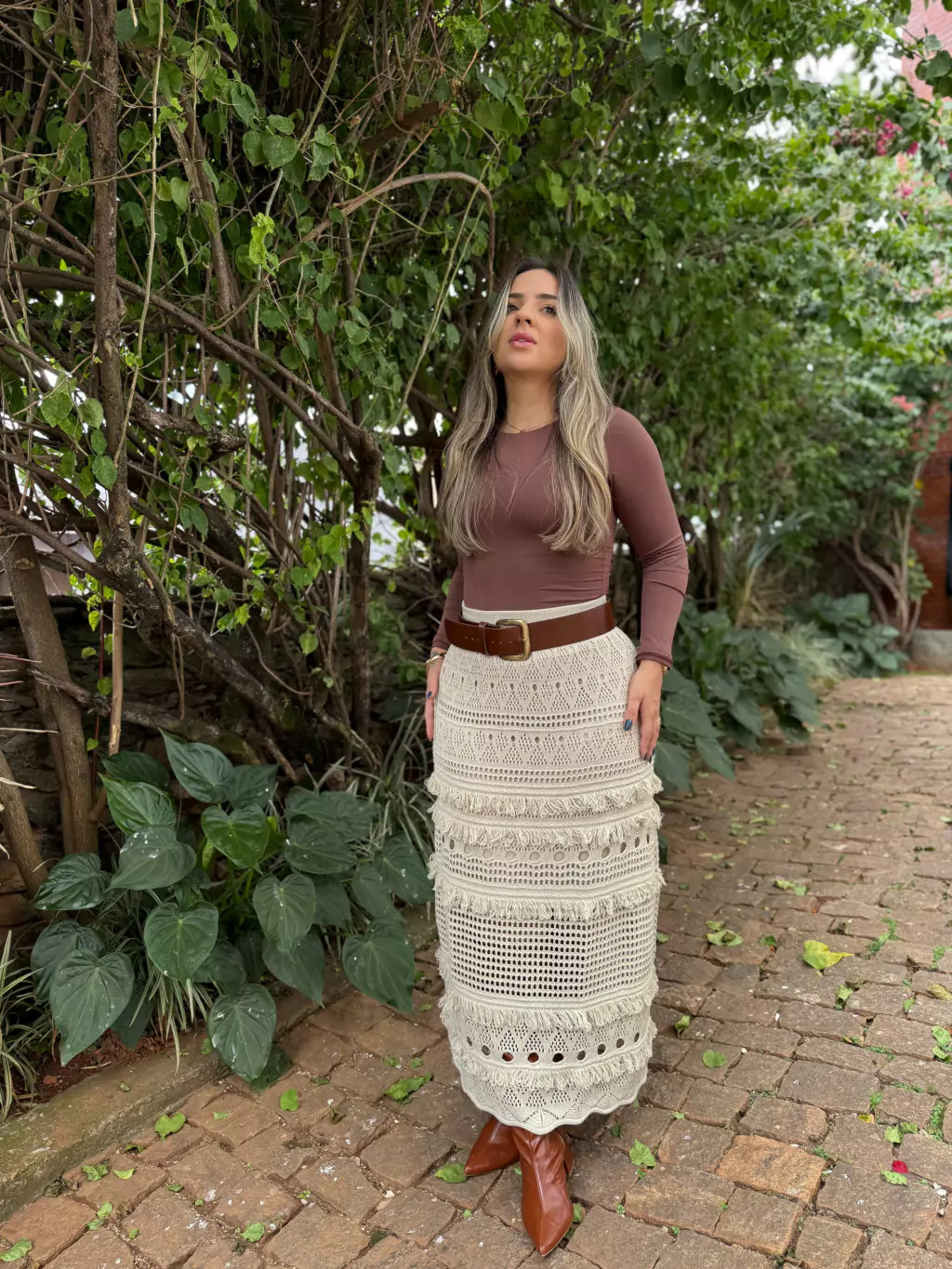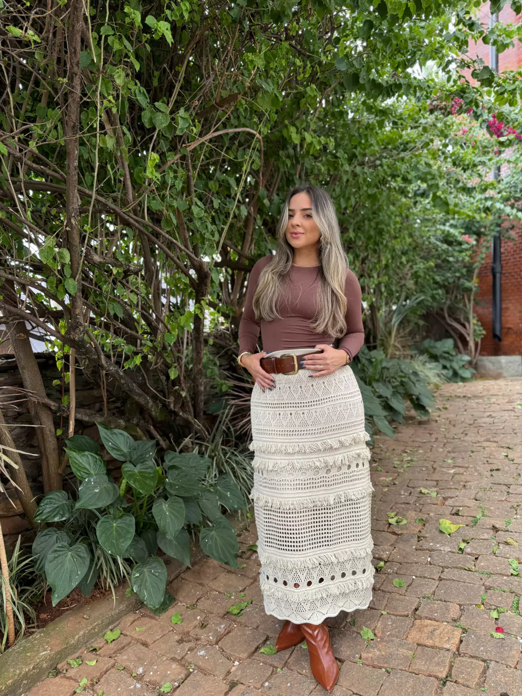 Disponível nas cores marfim, verde e marrom, a Saia Isadora é versátil e atemporal — perfeita para usar com botas, rasteiras ou até mesmo salto, em produções que vão do dia a dia ao especial.
