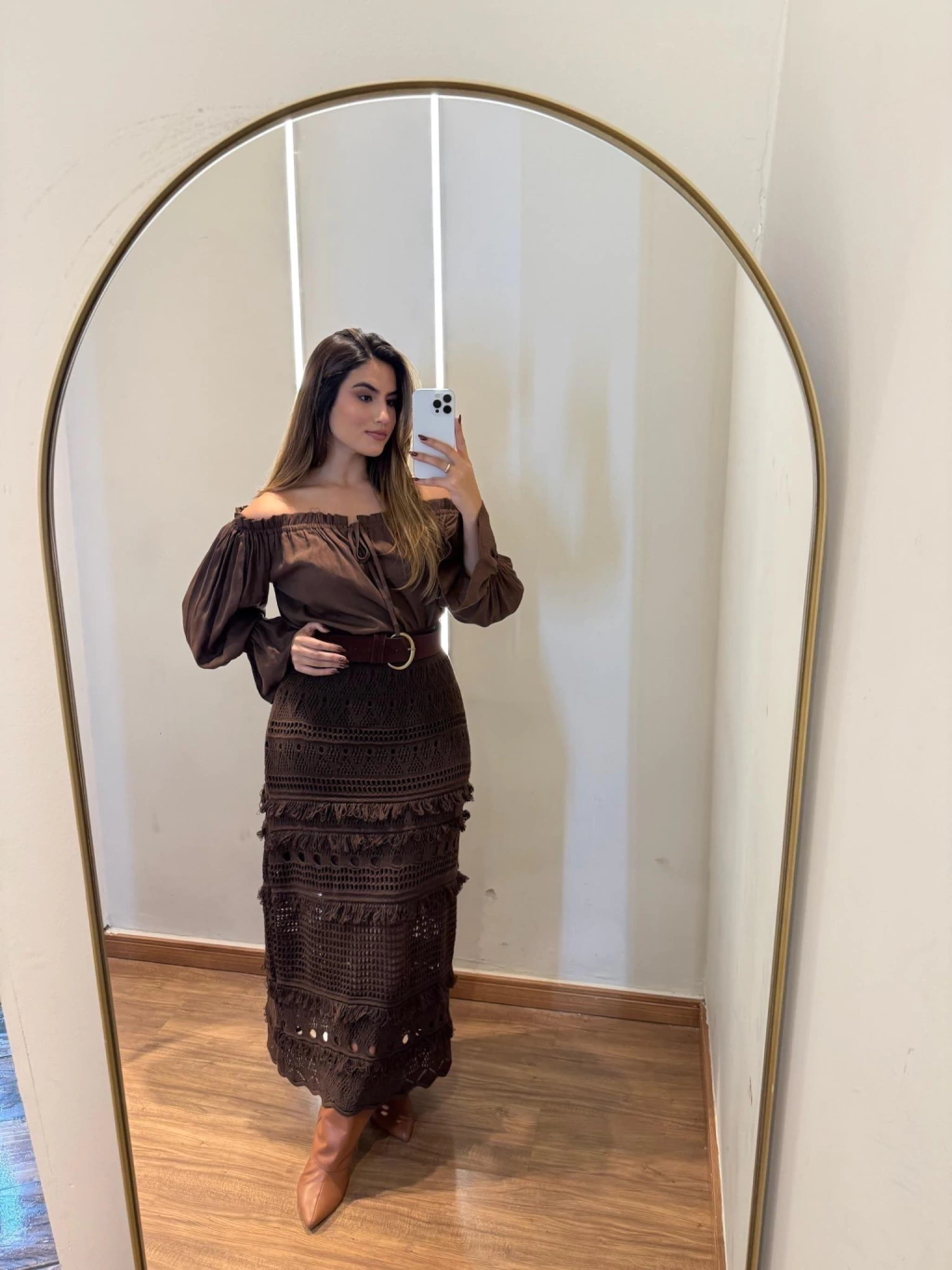 Com modelagem ajustada ao corpo e comprimento midi, ela valoriza a silhueta com elegância. As camadas de franjas e os pontos vazados geométricos trazem movimento, leveza e um charme autêntico à peça. O acabamento trabalhado na barra reforça o cuidado artesanal em cada detalhe.