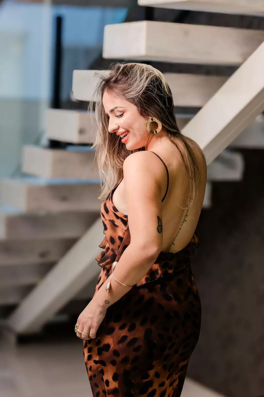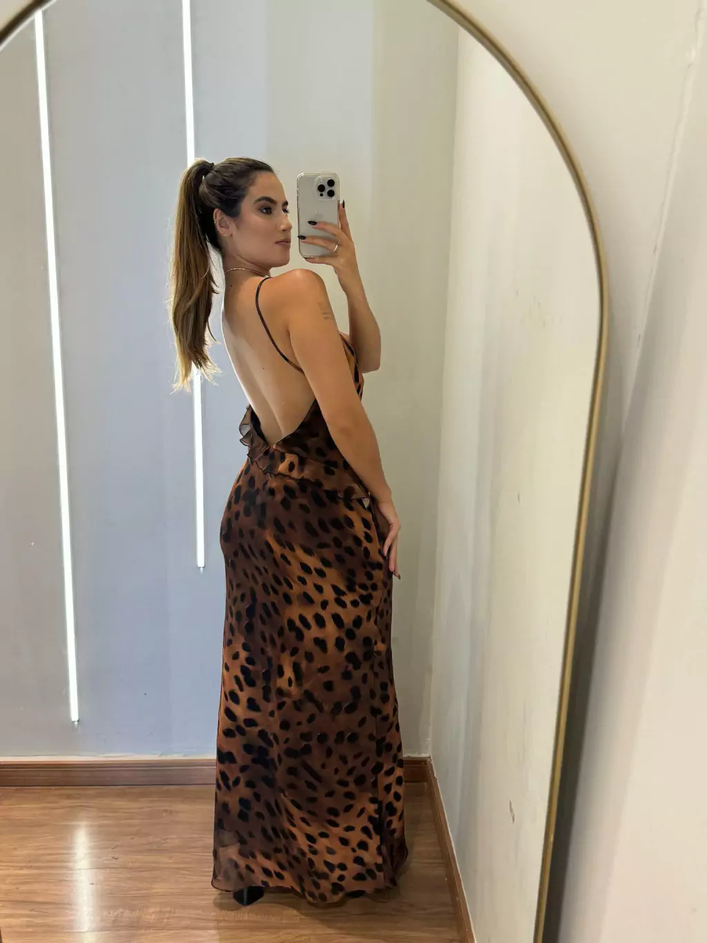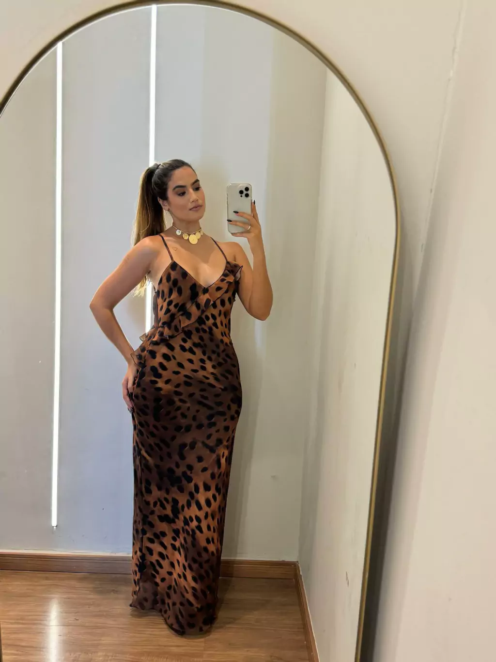 Um vestido que realça a feminilidade em cada detalhe. Com estampa animal print marcante e modelagem alongada, esse modelo é feito para quem ama presença com leveza. O babado delicado na parte frontal adiciona um toque de charme e movimento à peça.