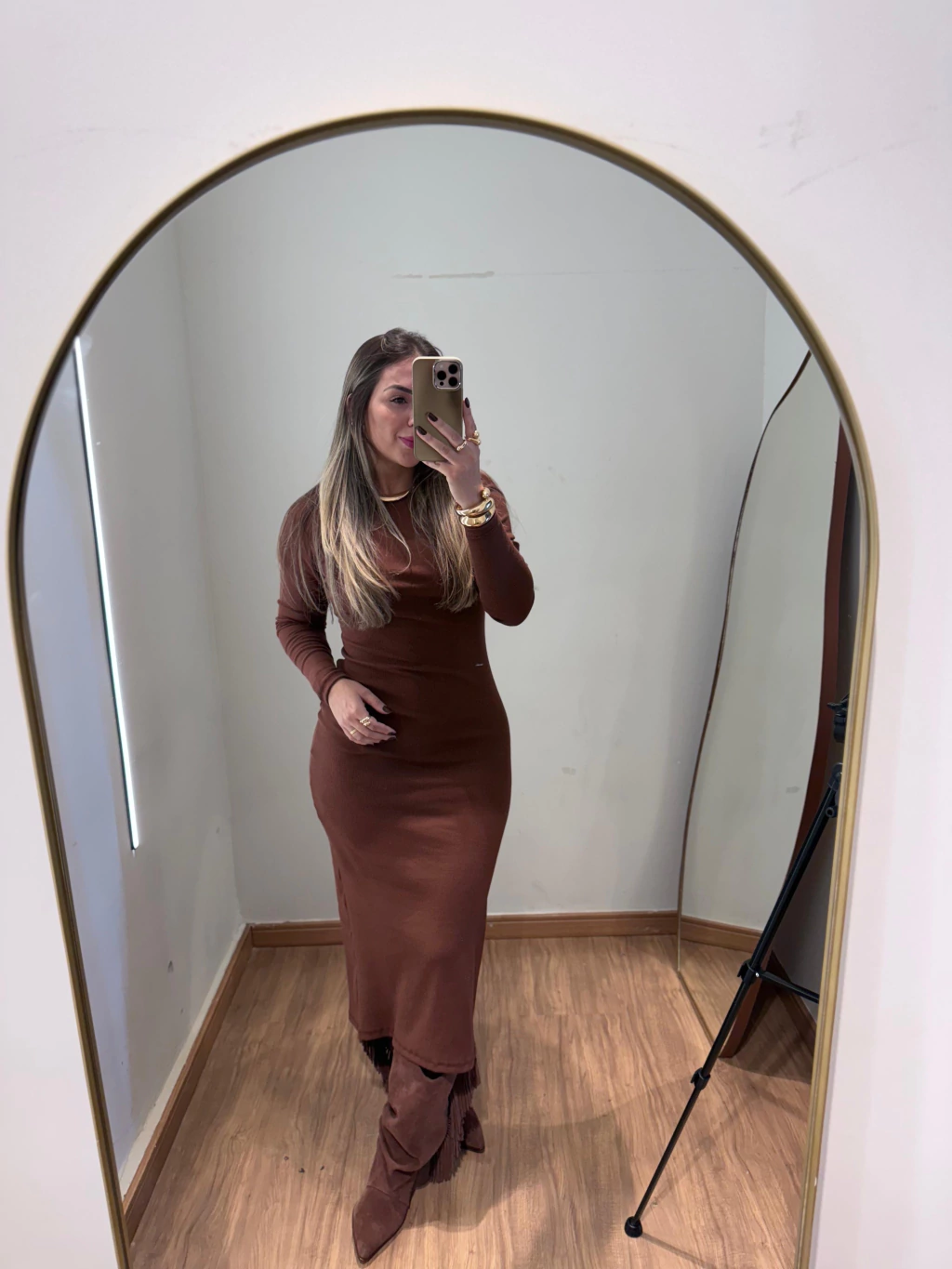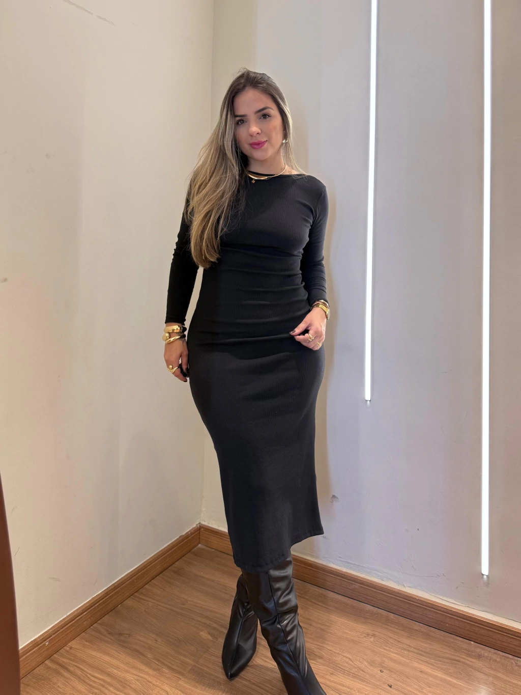 O vestido Isadora é a definição de elegância com conforto. Confeccionado em tecido canelado Ribana com elastano, ele se ajusta ao corpo com perfeição, valorizando a silhueta sem apertar. O modelo tem manga longa e decote fechado na parte da frente, com um corte mais reto e minimalista no topo — ideal para quem gosta de sofisticação discreta.