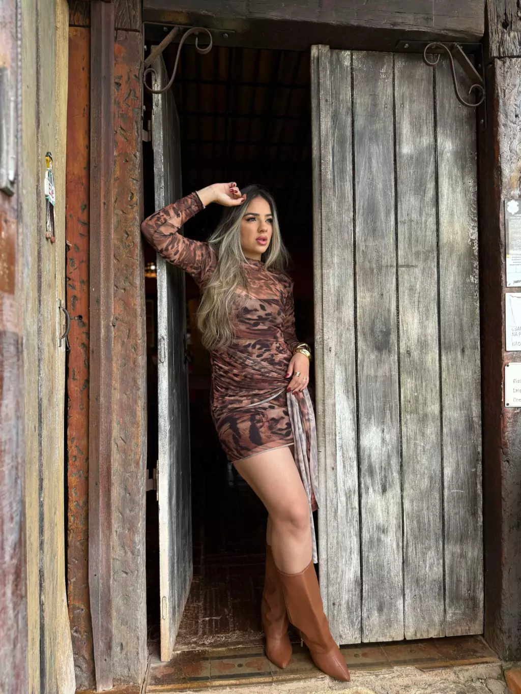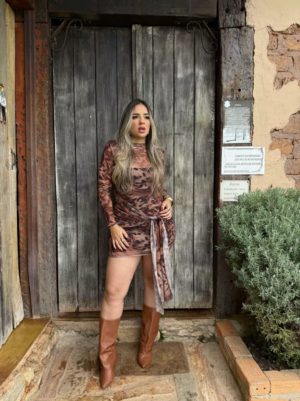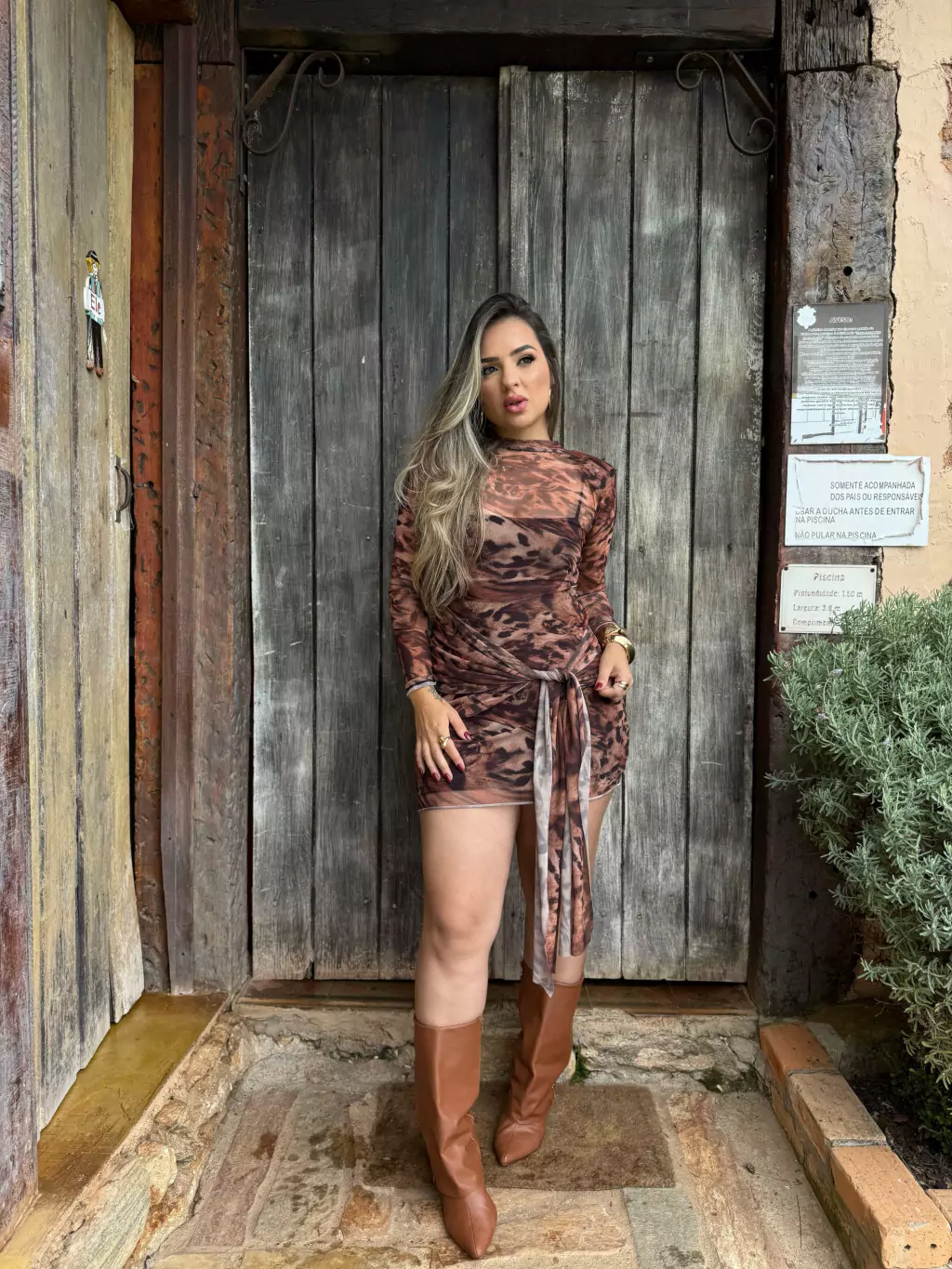 Um look poderoso e cheio de personalidade! Esse vestido é confeccionado em tule estampado, com forro interno que garante conforto e segurança. A modelagem ajustada valoriza a silhueta, enquanto as ombreiras trazem estrutura e um toque de sofisticação. Possui mangas longas e detalhe de amarração frontal que dá charme extra à peça. Perfeito para ocasiões especiais ou para quando você quiser se destacar com estilo.